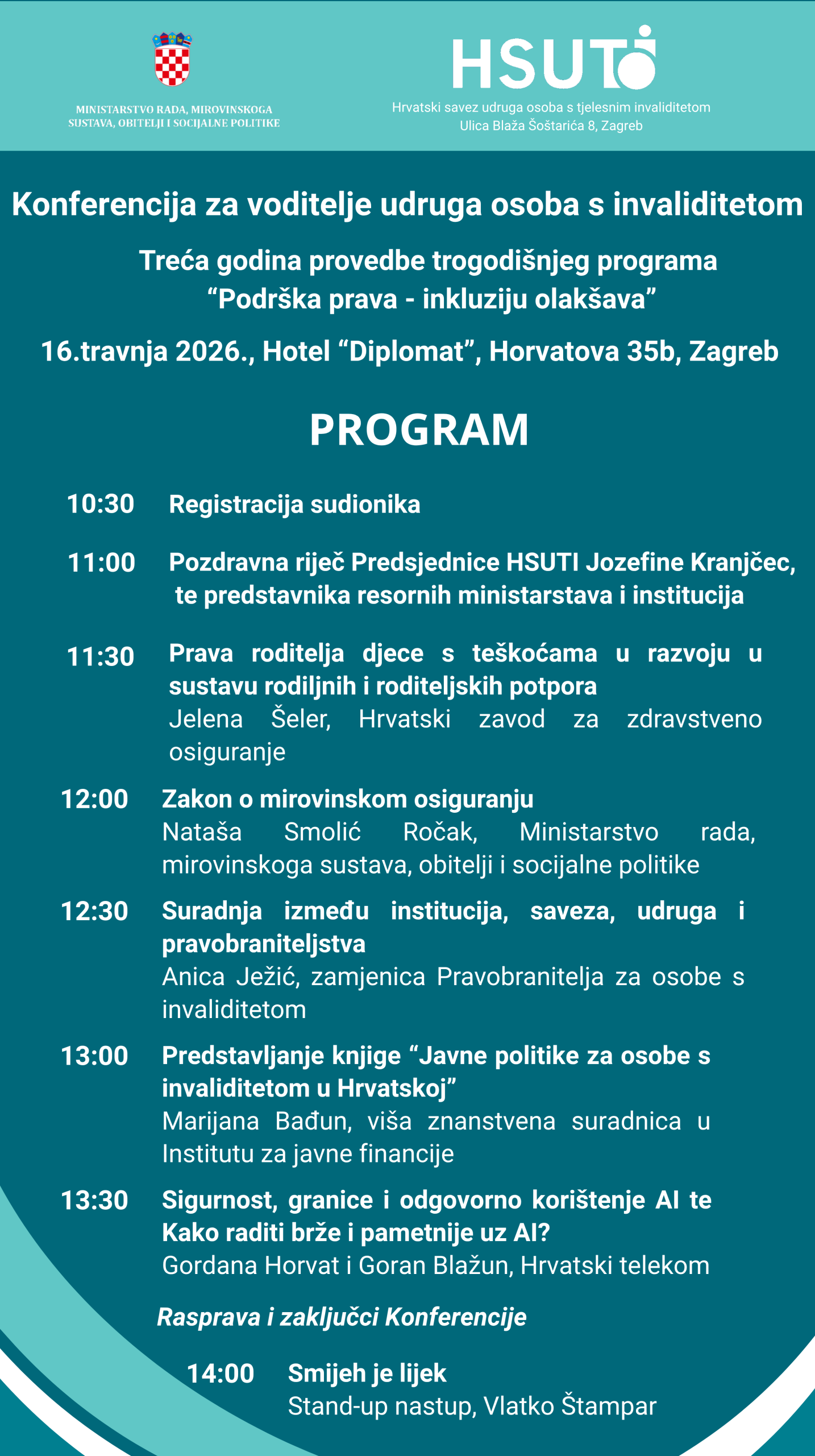 U organizaciji Hrvatskog saveza udruga osoba s tjelesnim invaliditetom, 16. travnja 2026. godine u hotelu “Diplomat”, u Zagrebu održana je Konferencija za voditelje udruga osoba s invaliditetom, u sklopu treće godine provedbe trogodišnjeg programa „Podrška prava – inkluziju olakšava“, kojeg financijski podržava Ministarstvo rada, mirovinskoga sustava, obitelji i socijalne politike.